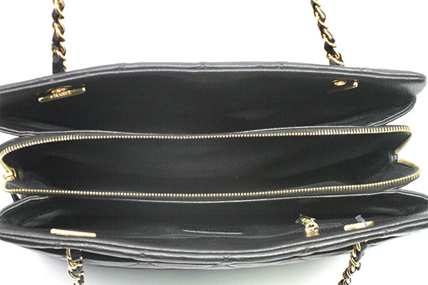 Leather caviar diamond quilted handbag has a stylish gold tone chain and leather strap.